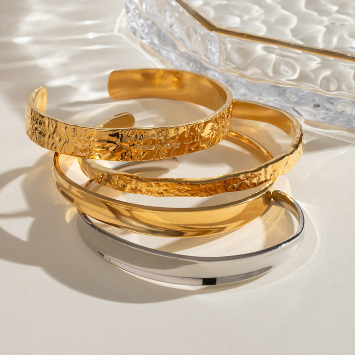 Enhance your style with the timeless charm of the 18K Gold Stainless Steel Bracelet. Crafted with precision and electroplated for a radiant finish, this bracelet combines the durability of stainless steel with the luxurious appeal of 18K gold. Its minimalist "ins style" design, featuring sleek linear details, makes it the perfect accessory for adding a touch of sophistication to any outfit, whether casual or formal.