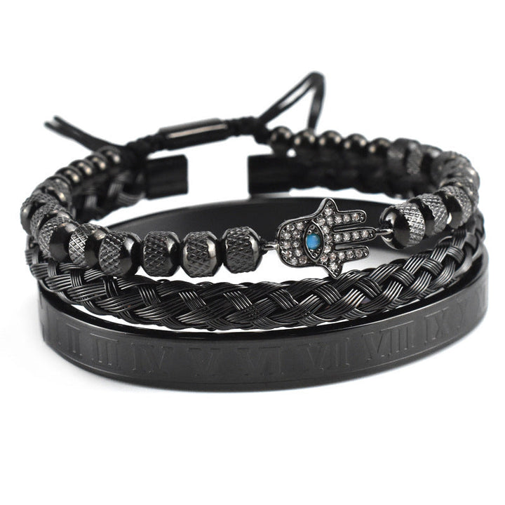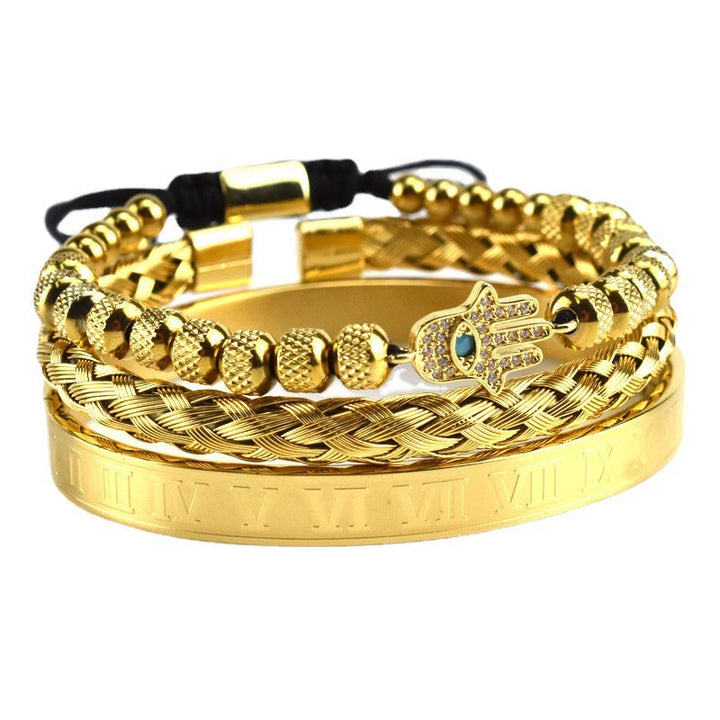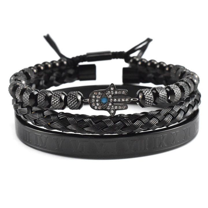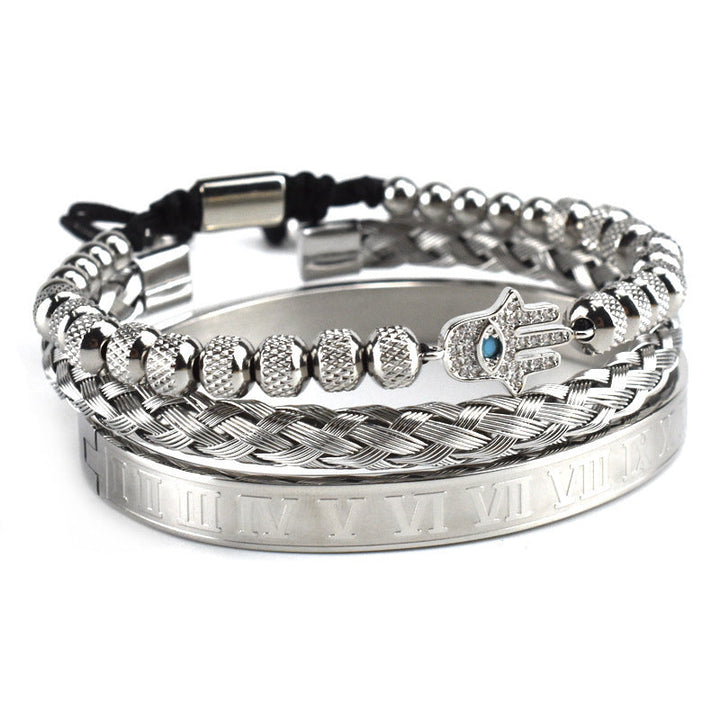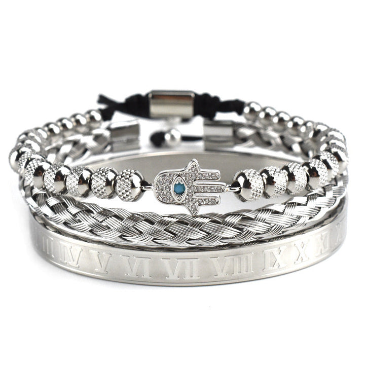 Add a touch of sophistication to your style with the Stainless Steel Roman Bracelet Set. This three-piece set is crafted from high-quality stainless steel and features sleek electroplated finishes that ensure long-lasting shine and durability. Designed in the trendy "ins" style, these bracelets showcase Roman numerals and sleek geometric elements that symbolize timelessness and strength. Suitable for both men and women, this set is perfect for anyone looking to elevate their everyday look with a versatile and polished accessory.